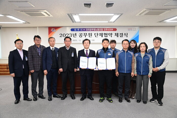 진주시와 전국공무원노동조합 진주시지부는 26일 시청 5층 상황실에서 ‘2023년 공무원 단체협약 체결식’을 개최했다.