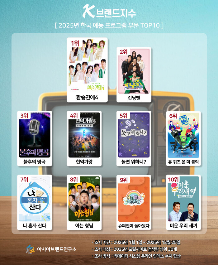 이번 K-브랜드지수 올해의 예능 부문은 2025년 포털사이트 검색량 상위 30개를 대상으로, 2025년 1월 1일부터 12월 25일까지의 온라인 빅데이터 44억 9510만 2397건을 분석했다.