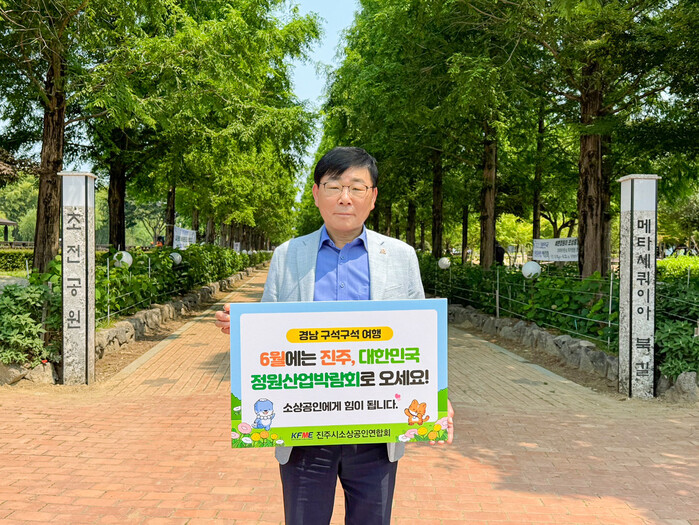 사진있음 : 정해식 진주시소상공인연합회장이 6월 개최 예정인 대한민국 정원산업박람회 개최 장소인 초전공원에서 “경남 구석구석 여행하기”릴레이 캠페인을 실시하고 있다.
