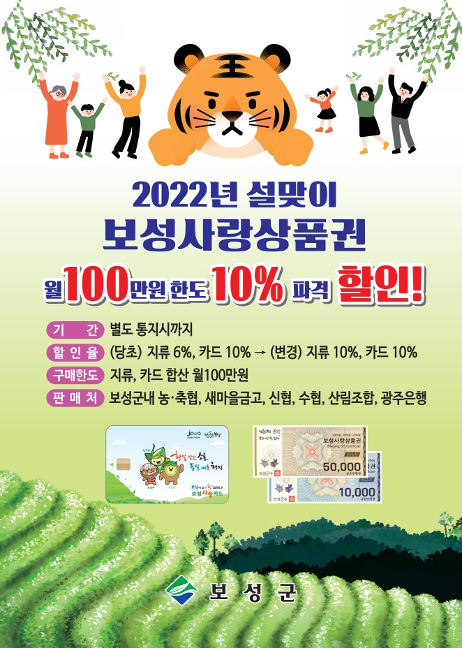 보성군은 오는 24일부터 별도 통지시까지 지역화폐인 보성사랑상품권 지류형 할인율을 10%로 상향 조정한다고 밝혔다. 구매 한도도 기존 월 70만원에서 100만원으로 확대됐다.