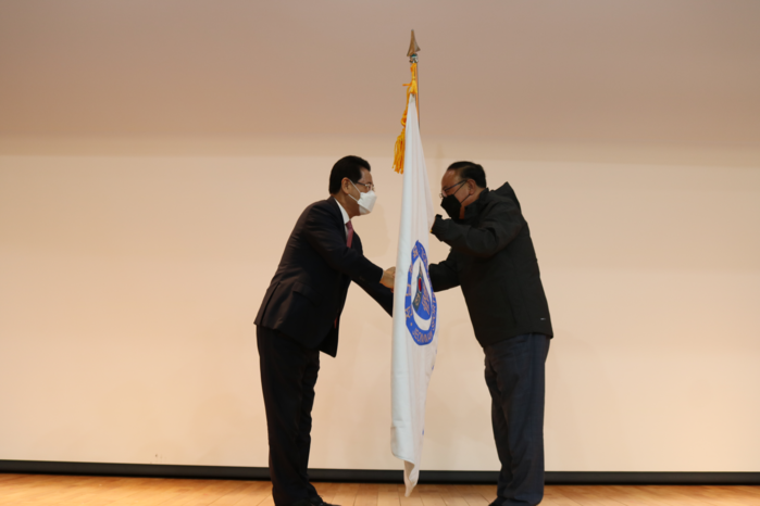 | ▲ 제103회 전국체육대회 결단식에서 김영록 도지사가 최기동 전남도체육회장 직무대행에게 선수단기를 전달하고 있다.(출처=전남도체육회) |