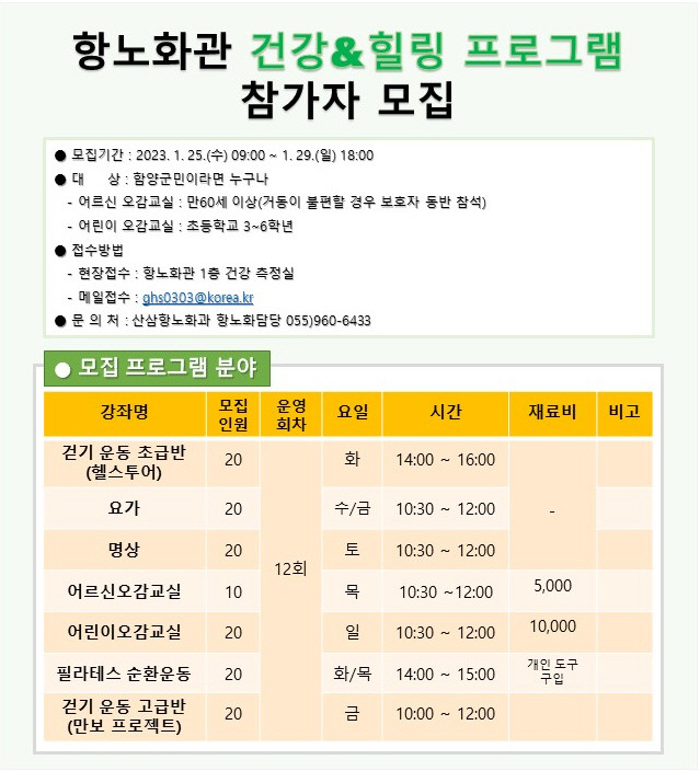함양 상림공원 인근 항노화관에서 진행되는 2023년 1분기 건강·힐링 프로그램은 2월 1일부터 4월 30일까지 12주간 운영되며, 이번에 모집하는 프로그램은 요가, 명상, 헬스투어, 만보프로젝트, 필라테스를 비롯한 어린이, 어르신 대상 오감교실로 총 7개 프로그램이 운영된다.
