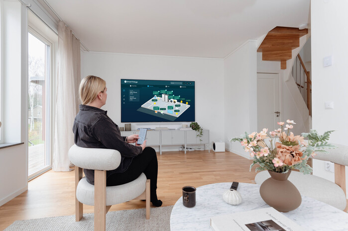 | ▲ 삼성전자 직원이 스마트싱스를 활용해 '브로비홀름 스마트시티(Brobyholm Smartcity)'에 구축된 '넷 제로 홈' 솔루션을 체험하고 있다.(사진=삼성전자 제공) |