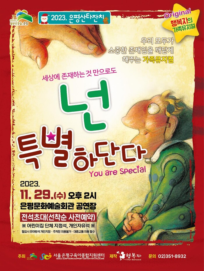 [시민일보 = 이대우 기자] 은평구(구청장 김미경)는 연말을 맞아 2023년 은평산타잔치 가족뮤지컬 ‘넌 특별하단다’을 개최한다고 27일 밝혔다.