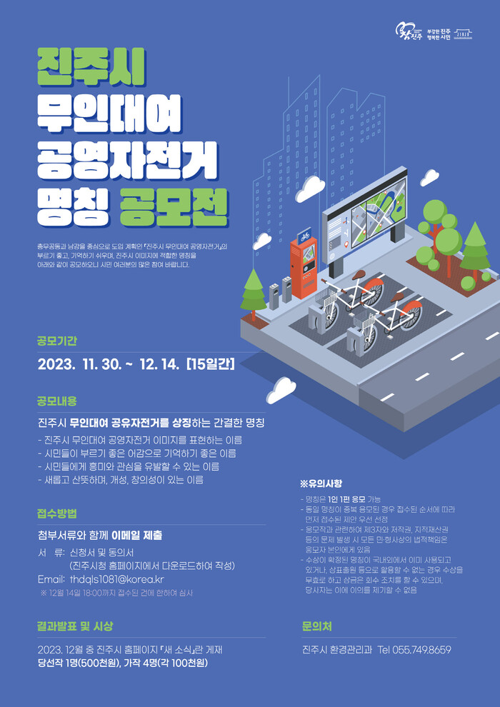 진주시 관계자는 “시민들의 적극적인 시정 참여와 소통을 위해 이번 공모를 추진하게 됐다”며 “많은 시민들의 참여를 통해 공영자전거 이용 활성화에 기여하고자 한다”고 말했다.