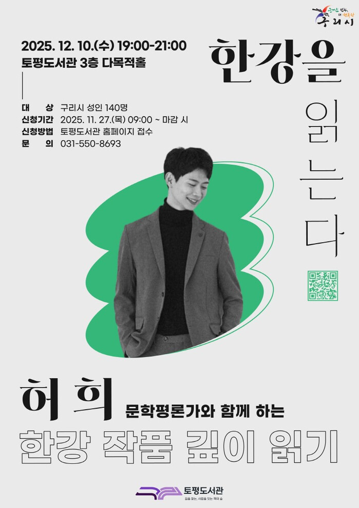 이번 특강은 한강 작가의 노벨문학상 수상 1주년을 기념해 마련된 프로그램으로, 오는 12월 10일(수) 저녁 7시 토평도서관 3층 다목적홀에서 진행된다.