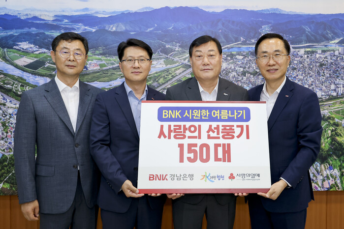 [합천=이영수 기자] 경남은행은 13일 합천군청을 방문해 이웃돕기 성품 선풍기 150대를 기탁했다.