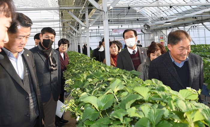 이날 현장방문은 청년경영실습임대농장 조성과정과 딸기 재배현황 설명, 스마트팜 시연 순으로 진행했으며 직접 딸기를 따서 시식해 보기도 했다.