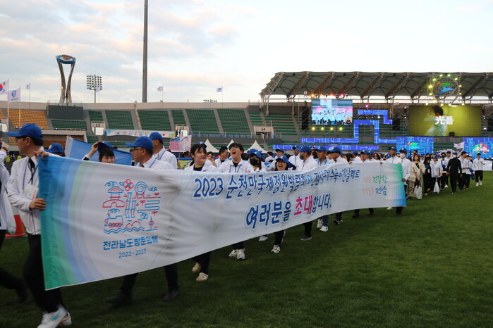 지난 28일 열린 개회식에서 3번째로 입장한 전남선수단은 2023 전남 방문의 해와 올 10월에 목포시를 중심으로 전남에서 개최되는 제104회 전국체육대회, 순천만국제정원박람회, 전남국제수묵비엔날레 등을 적극 홍보하며 구미시민과 전국의 생활체육동호인, 관람객들의 눈길을 끌었다.