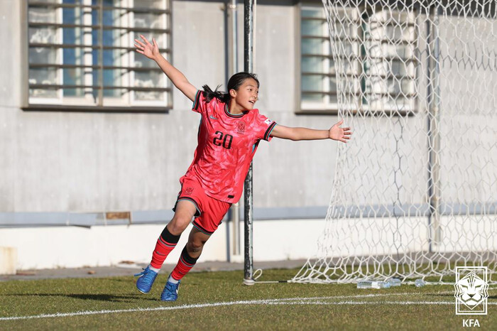 ▶석채은이 한일교류전 1차전에서 선제골을 기록한 뒤 기뻐하고 있다.[사진=대한축구협회]
