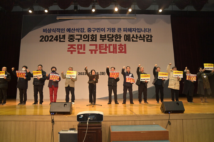 [시민일보 = 여영준 기자] 서울 중구(구청장 김길성)는 지난 26일 주민자치위원장, 직능단체장 등 주민 300여 명이 구민회관 대강당에서 '중구의회 예산삭감 규탄대회'를 열었다고 밝혔다.