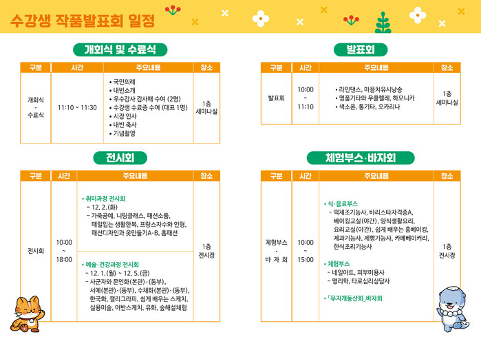 그림 전시는 12월 1일부터 5일까지 진행되며, 수료식과 발표회, 공예 전시, 체험부스, 무지개동산회 바자회는 12월 2일 오전 10시부터 오후 3시까지 당일 하루만 진행된다.
