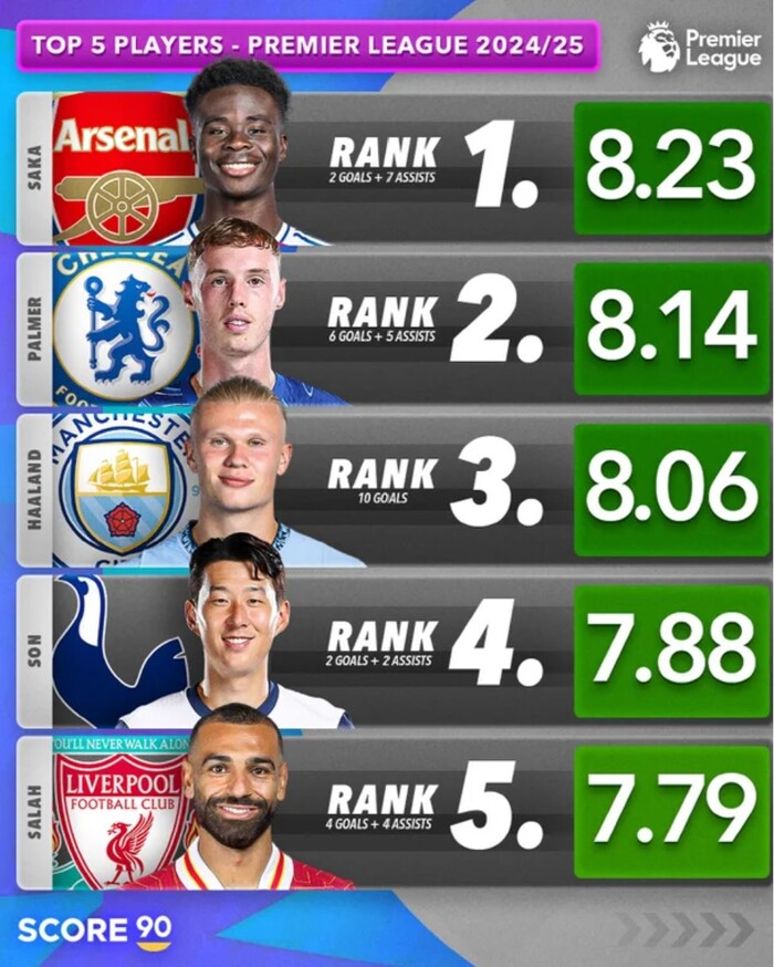 축구 콘텐츠 매체 SCORE90는 잉글랜드 프리미어리그(EPL) 톱랭킹 5명의 선수에 손흥민의 이름을 올려 화제가 되고 있다. 지금까지 리그 5경기에서 2골 2도움을 기록한 손흥민은 7.88점이라는 높은 점수로 4위에 자리했다.