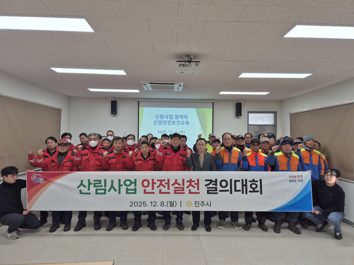 진주시가 ‘2025년 산림재난 안전사고 제로(ZERO)’ 달성을 앞두고 8일 초전공원 교육장에서 산림재난 분야 종사자를 대상으로 ‘안전사고 예방교육과 결의대회’를 실시했다.