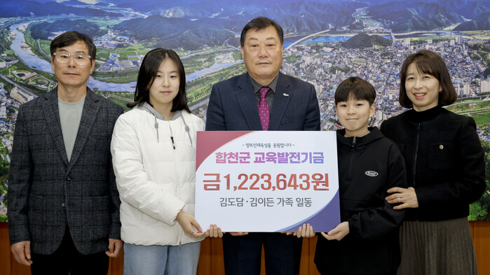 한편 김도담‧김이든 가족은 매달 10만원씩 용돈 등으로 모아온 적금이 만기가 되면 그 이자까지 포함해서 매년 합천군 교육발전기금에 정기 기탁을 하고 있다. 2017년부터 시작해 올해 8년차로 가족의 아름다운 선행을 계속 이어가고 있어 훈훈함을 주고 있다. 또 2020년도부터는 합천군가족사랑봉사단으로 활동하고 있으며 올해 3월 15일까지 새내기봉사 가족도 모집하고 있다.