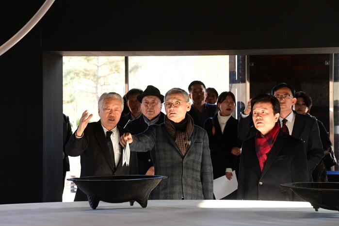 유인촌 장관은 이날 조규일 진주시장, 조일상 예술감독의 안내로 전시장을 관람하고 진주 소목장인들의 주요 작품을 둘러봤다.
