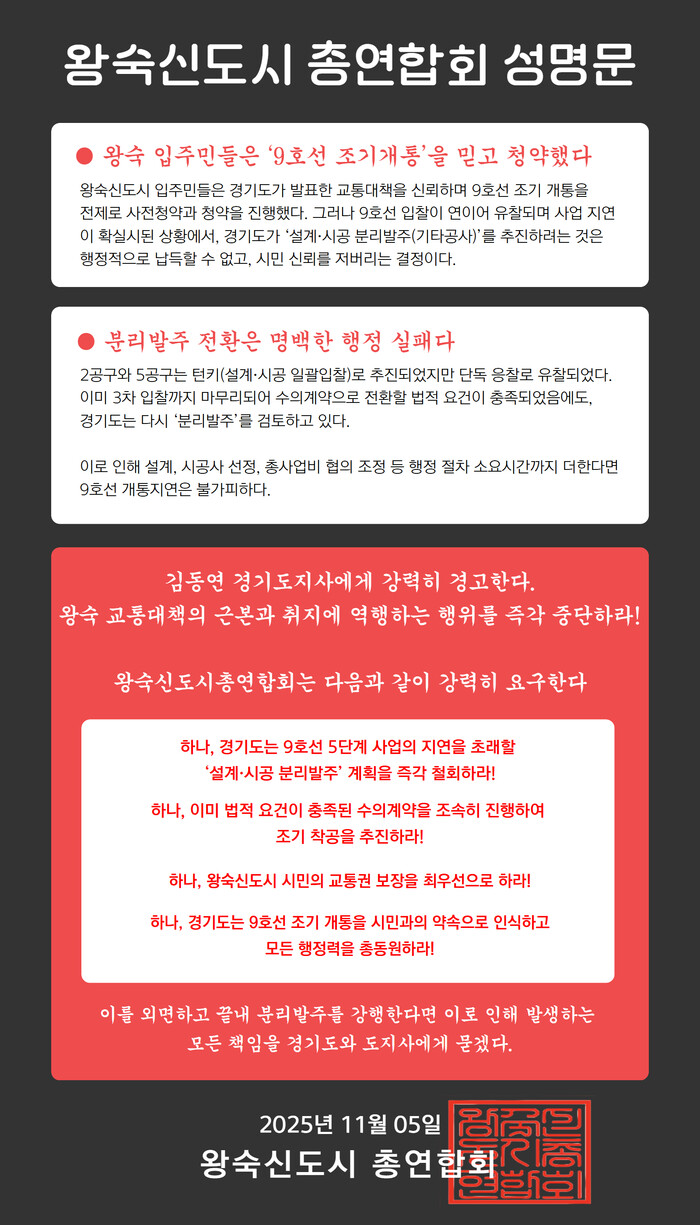 반면 왕숙신도시총연합회는 “3차 입찰까지 진행된 상황에서 수의계약 전환이 가능한데도 기타공사로 되돌아가면 설계 재검토, 시공사 재선정 등 절차로 수년이 지연될 것”이라며 강하게 반대했다. 총연합회는 ▲분리발주 계획 철회 ▲수의계약 신속 추진 ▲경기도의 교통 인프라 행정 책임 이행을 촉구하며, 대광위와의 면담 및 행정감시 활동 강화에 나설 방침이다.