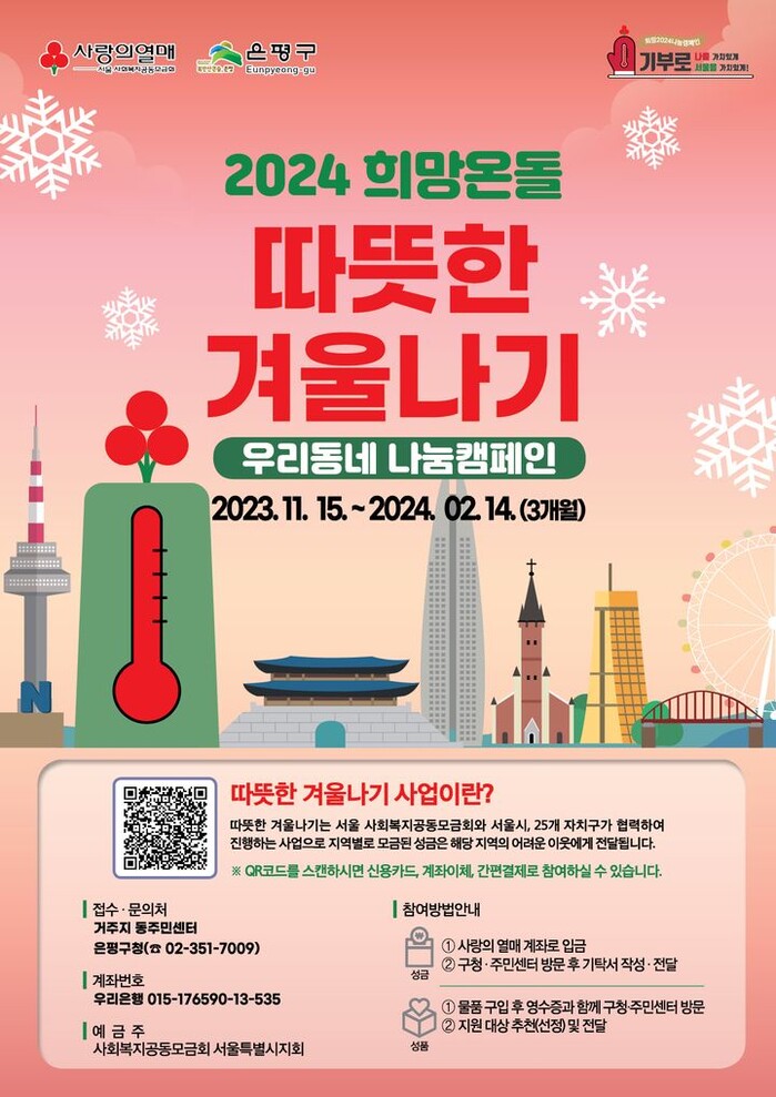 은평구 성금 접수 계좌는 우리은행(사회복지공동모금회 서울특별시지회)이며, 스마트폰을 이용한 큐알(QR)코드 성금 기부도 가능하다.