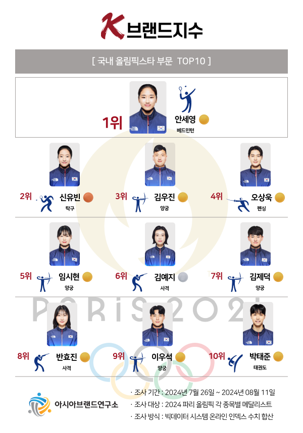 아시아브랜드연구소 류원선 리서치센터장은 “대한민국 선수단이 2024 파리 올림픽에서 기적을 연출했다. 이번 올림픽은 21개 종목 선수 144명으로 이뤄진 ‘소수 정예’ 참가에도 불구하고 2008 베이징 올림픽 이래 최대 성과(금메달 13개, 은메달 9개, 동메달 10개)를 거두며 무더위에 지친 국민들에게 시원한 즐거움을 선사했다”라고 설명했다.