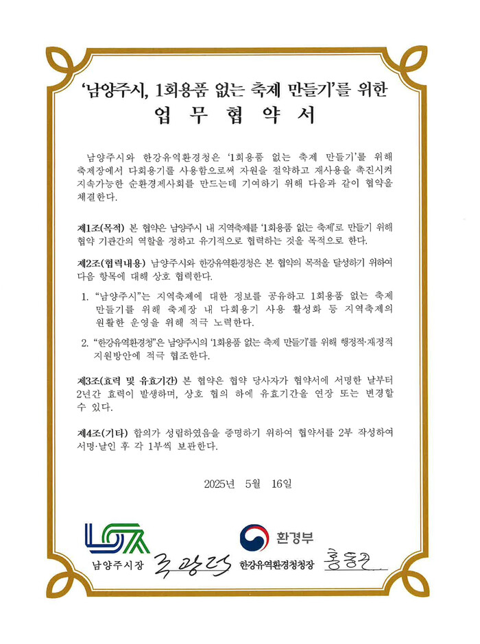 한강유역환경청은 남양주시가 추진하는 친환경 축제의 안정적 운영을 위해 행정적·재정적 지원을, 시는 축제 정보 공유와 축제장 내 다회용기 사용을 활성화해 시민이 체감할 수 있는 환경 개선을 이끌 방침이다.