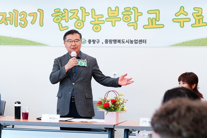 | ▲ 지난 4일 오후 중랑행복도시농업센터에서 열린 ‘제3기 현장농부학교 수료식’에 참석한 류경기 구청장.(사진=중랑구청 제공) |