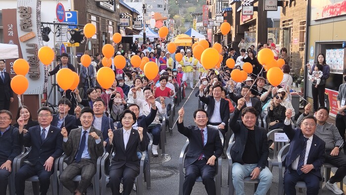 | ▲ 강진원 강진군수(앞줄 오른 쪽부터 세 번째)가 김보미 강진군의장 및 관계자 등과 함께 탄탄대로 축재가 열린 강진읍 중앙로상가에서 풍선을 들고 축제를 즐기고 있다. / 강진군 제공 |