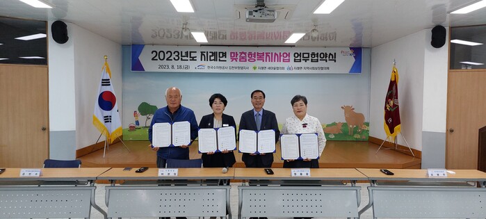 [김천=박병상 기자] 경북 김천시 지례면행정복지센터는 지난 18일 오전 10시에 한국수자원공사 부항댐지사, 지례면 새마을협의회, 지역사회보장협의체와 맞춤형 복지사업 협약을 체결했다.