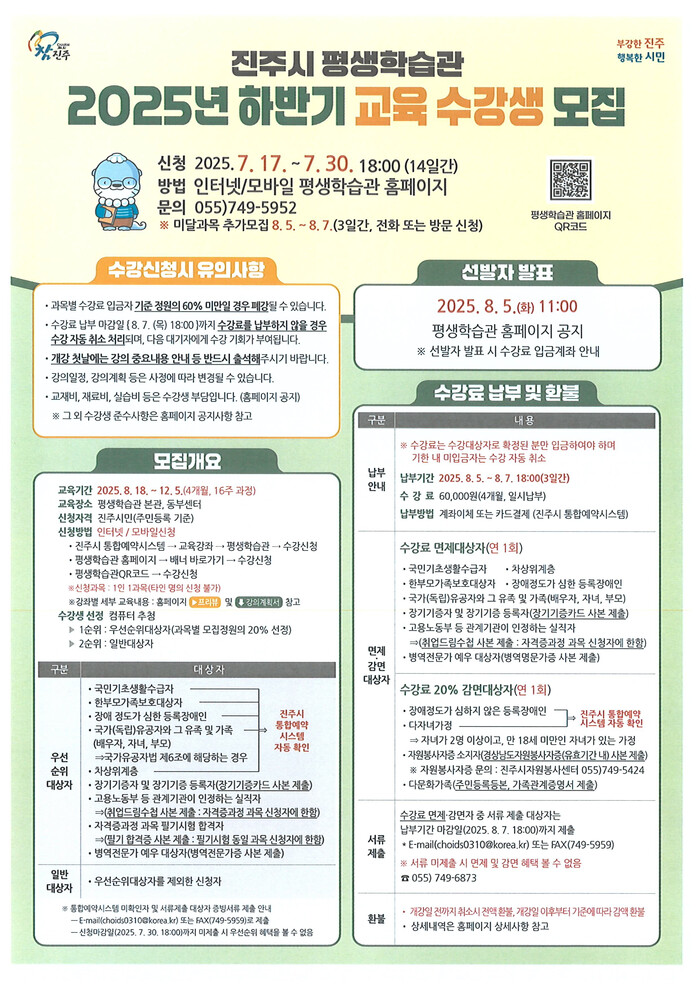 진주시 평생학습관은 ‘2025년 하반기 정기교육’수강생을 7월 17일부터 30일까지 14일간 70개 과목에 1,324명의 수강생을 모집한다.