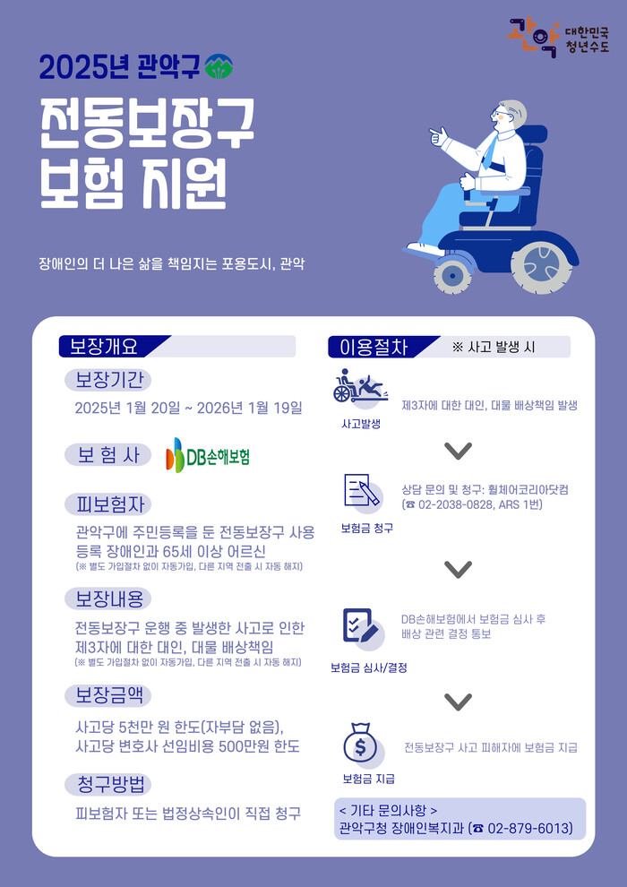 지원 대상은 전동휠체어, 전동스쿠터 등 전동보장구를 이용하는 관악구 거주 등록 장애인 및 만 65세 이상 어르신이며, 대상자는 별도의 가입 절차 없이 자동 가입된다.