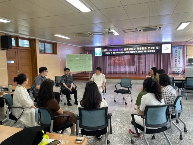 이번 연수는 합천 Wee프로젝트 담당자인 Wee클래스·센터 전문상담사, 전문상담교사뿐만 아니라 평소 상담에 관심 있는 교사들을 대상으로 이루어졌으며, 특히 이번 연수는‘15세(중2) 청소년을 위한 집단상담프로그램’으로 십오통활 집단상담 프로그램 전문가이자, 현 수원대학교 교육대학원 채선기 교수가 이번 강의를 맡아 이끌어 주었다.
