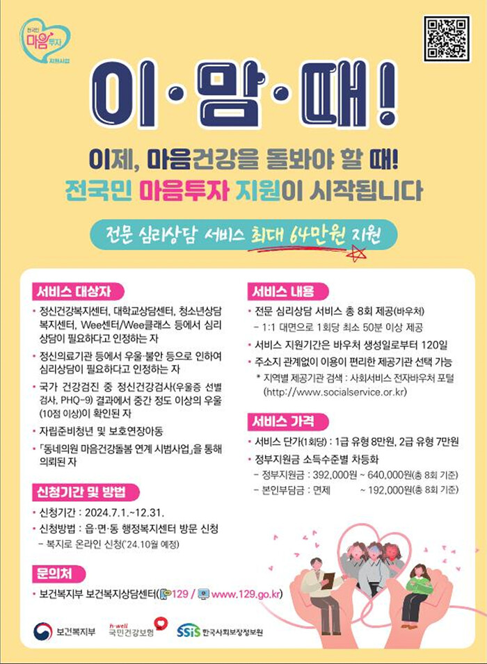 지원 대상으로 선정되면 총 8회(회당 최소 50분 이상) 1:1 대면 심리상담 서비스를 받을 수 있는 바우처가 제공된다. 서비스 이용 시에는 기준중위소득 기준에 따른 본인부담금만 납부하면 된다. 바우처 신청은 오는 7월1일부터 주민등록상 거주지 주민센터에서 가능하다.