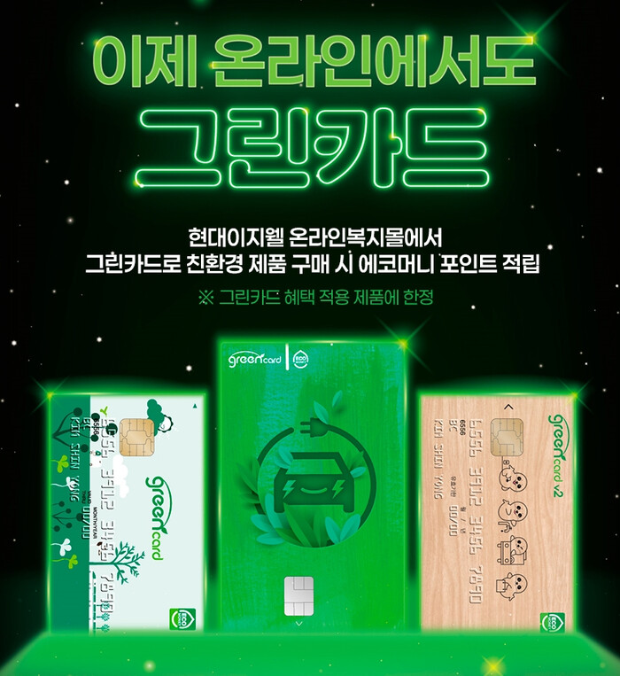 기존 오프라인 가맹점에서만 제공되던 인센티브 적립 서비스를 현대이지웰이 처음으로 온라인까지 확대해 선보이는 것으로, 그린카드 온라인 적립 서비스는 고객이 현대이지웰 온라인 복지몰에서 환경표지 인증제품·저탄소제품·친환경 인증 농산물 등 적립대상 상품을 그린카드(신용·체크카드)로 구매 시 구입액의 5~25%를 에코머니 포인트로 적립해 준다.