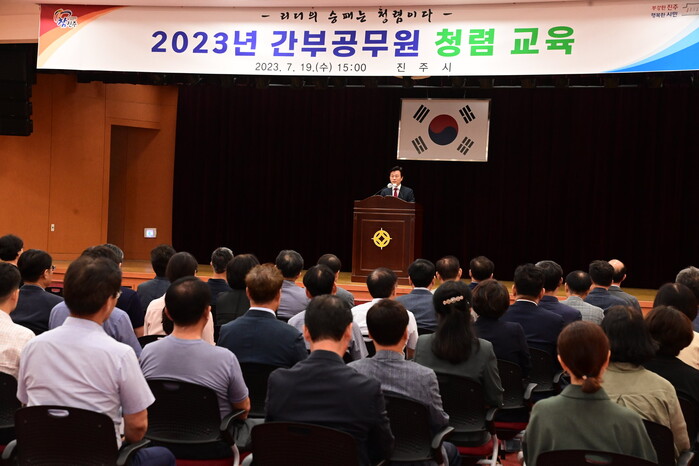 이날 교육에 참석한 조규일 진주시장은 “공직자로서 공렴(公廉)이 가장 큰 덕목임을 인식하고, 이번 교육이 신뢰받는 공직사회로 나아가기 위한 청렴 수준을 한 단계 높이는 계기가 되기를 바란다”며 “시민의 신뢰와 협조를 통해 주요 성과를 창출해야 하는 중요한 시기에 부패 발생 요인을 사전에 차단하는 데 간부공무원들이 솔선수범해야 한다”고 말했다.