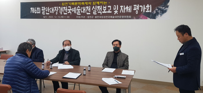 팔만대장경전국예술대전운영위원회(위원장 이영진)는 2022년도 '제6회 팔만대장경전국예술대전' 실적보고 및 자체 평가회를 지난 15일 합천문화예술회관 소회의실에서 개최했다.