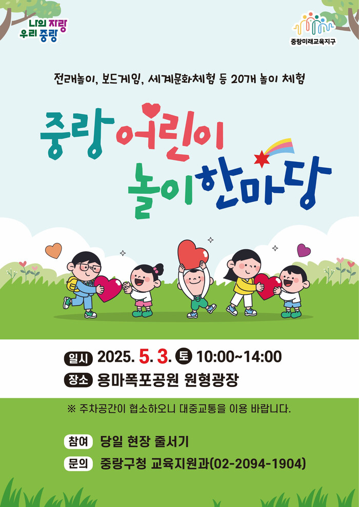 먼저, 오는 3일 용마폭포공원 원형광장에서 오전 10시부터 오후 2시까지 ‘2025 중랑 어린이 놀이한마당’이 개최된다.