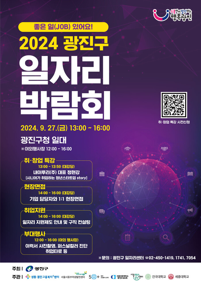 [시민일보 = 여영준 기자] 서울 광진구(구청장 김경호)가 오는 27일, 광진구청에서 ‘2024 광진구 일자리박람회’를 개최한다.