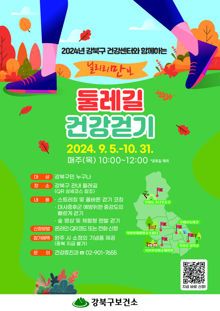 [시민일보 = 여영준 기자] 서울 강북구(구청장 이순희)는 오는 9월5일~10월31일 둘레길을 함께 걷는 ‘닐리리만보 둘레길 건강 걷기’ 프로그램을 운영한다고 밝혔다.