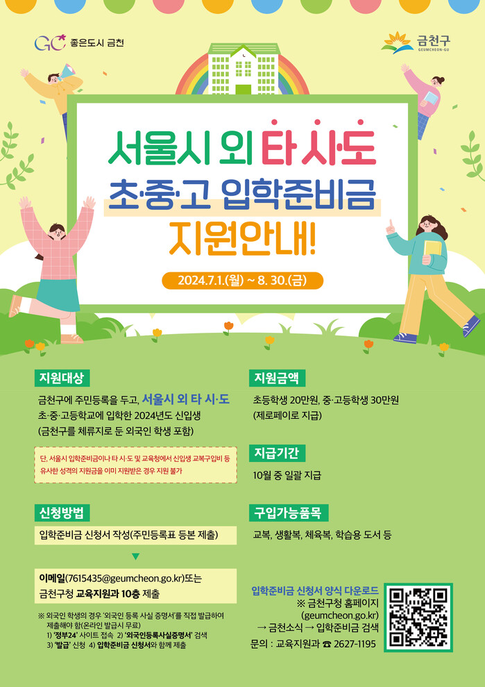 [시민일보 = 여영준 기자] 금천구(구청장 유성훈)는 서울시 외 타 시·도에 소재하는 초·중·고등학교에 입학한 금천구 신입생 중 입학준비금을 지원받지 못한 학생에게 입학준비금을 지원한다고 밝혔다.