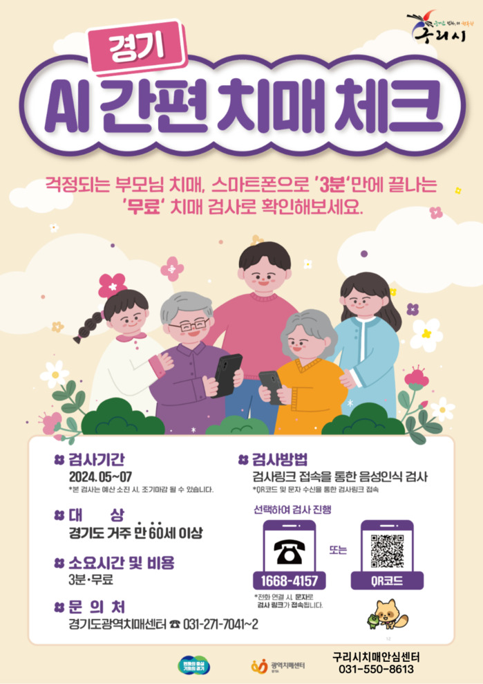 백경현 구리시장은 “AI 간편 치매 체크 무료 서비스를 통해 치매를 조기에 진단하고 효과적으로 관리할 수 있을 것으로 기대된다.”라며, “시간과 장소에 구애받지 않는 간편한 검사인 만큼 시민들의 많은 관심과 참여를 바란다.”라고 전했다.