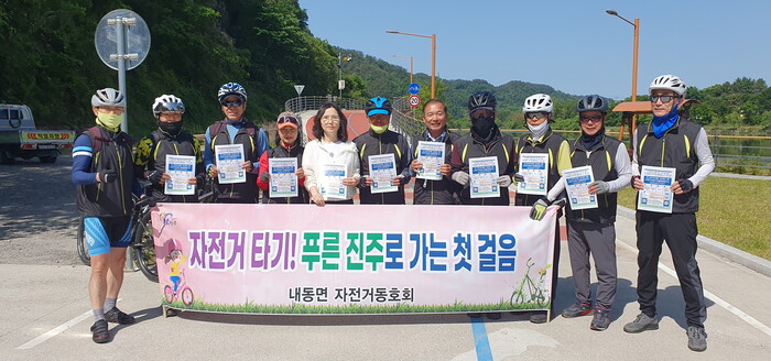 동호회는 내동면사무소 주차장에서 자전거 체인과 오일을 점검했으며, 남강변 자전거길에서 진주시지속가능발전협의회에서 추진하는 ‘남강길따라 자전거와 함께 일상 속 작은 실천’과 안전한 자전거길 이용 등 홍보 활동을 실시했다.