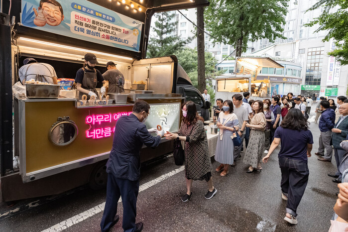 | ▲ 김경호 구청장이 30일 출근길 직원들에게 아이스크림을 선사하는 ‘친절 한스푼 소통 트럭’을 준비했다.(사진=광진구청 제공) |