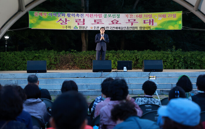 이 자리에 참석한 진병영 함양군수는 "올해로 15회째를 맞은 상림토요무대는 많은 군민의 사랑을 받는 지역문화예술향유 프로그램"이라며 "토요일마다 펼쳐지는 군민들의 공연으로 바쁜일상에서 잠시 벗어나 자연과 문화가 함께하는 문화예술 공연을 느껴 보기를 권한다"고 말했다.