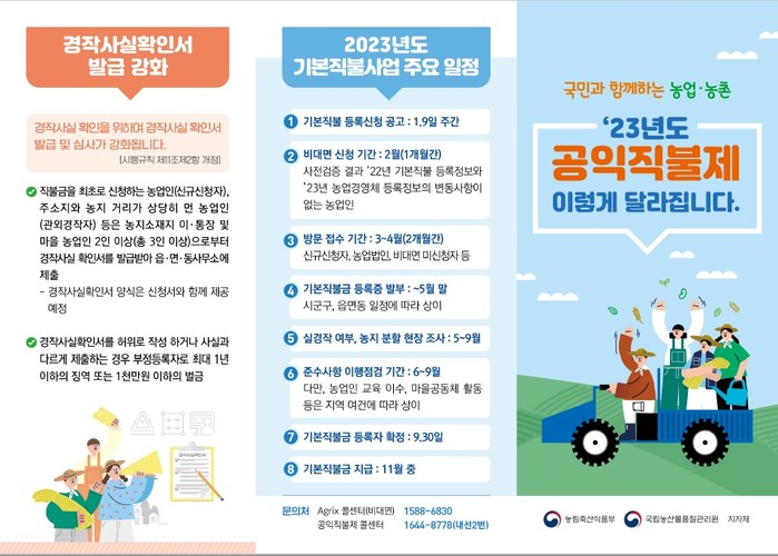 충북도 관계자는 “법 개정 후 사업이 본격 시행됨에 따라 실경작 여부, 부정한 농지분할 등 현장조사를 확대하여 부정수급을 방지하고, 미신청자가 최소화 되도록 농업인에게 적극 홍보하여 많은 농업인들이 공익직불금 혜택을 받을 수 있도록 최선을 다하겠다”라고 말했다.