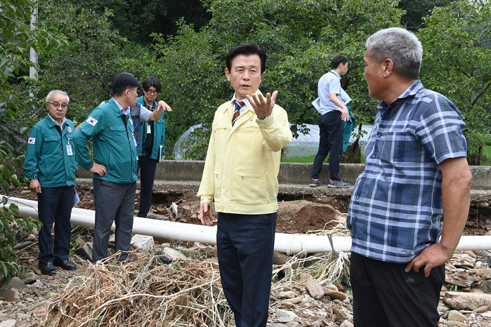 조규일 시장은 피해가 집중된 오미천 범람 지역, 명석면 외율마을 침수피해 현장, 남성지구 시도 17호선 도로 유실현장을 차례로 방문하며 주민들의 불편을 직접 청취하고, 관련 부서에 현장 복구와 향후 방지 대책을 지시했다.