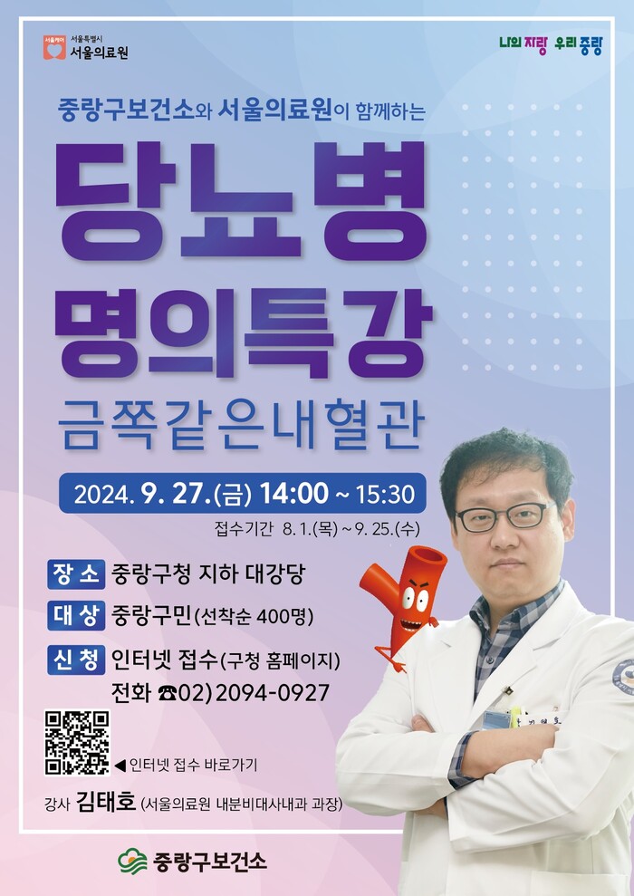 서울의료원 내분비대사내과 과장으로 재직 중인 김태호 박사가 강사로 나선다. 김태호 과장은 대한당뇨병학회의 주요 위원회에서 활동하며 국내외에서 수많은 당뇨병 관련 연수와 연구 활동을 진행해 온 전문가로, 구민에게 더욱 전문적인 강의를 전달할 예정이다.