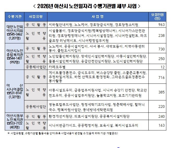 아산시 노인일자리는 △대한노인회 아산시지회 △아산시노인종합복지관 △아산시니어클럽 △아산시동부노인복지관 4개 기관에서 운영되며, 참여 희망자는 신분증, 주민등록등본, 통장 사본 등 필요한 서류를 갖춰 해당 기관을 직접 방문해 신청하면 된다.