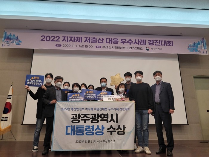 | ▲ 광주광역시, 행정안전부 2022 지자체 저출산 대응 우수사례 경진대회 대통령상 수상 기념촬영 / 광주광역시 제공 |