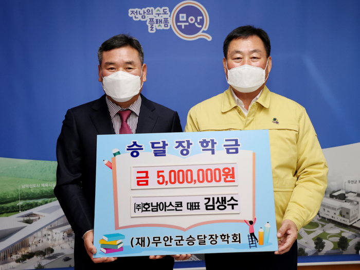 무안군은 지난 28일 현경면에 소재한 ㈜호남아스콘산업 김생수 대표가 (재)무안군 승달장학회에 지역인재 육성을 위한 장학금으로 써 달라며 장학기금 500만원을 기탁했다고 밝혔다.