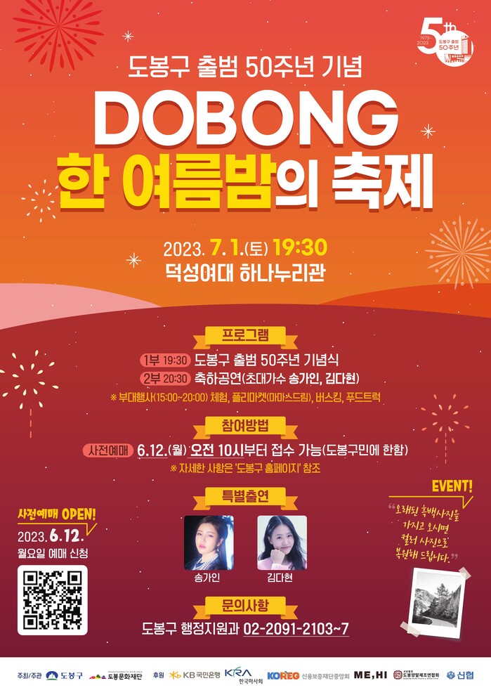 [시민일보 = 여영준 기자] 서울 도봉구(구청장 오언석)는 오는 7월 도봉의 50년의 역사를 만들어간 구민들과 함께 도봉구 출범 50주년을 기념하는 다양한 기념사업과 축제가 잇따라 열린다고 9일 밝혔다.