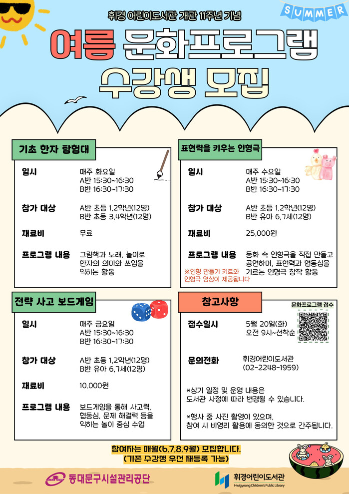 [시민일보 = 이대우 기자] 동대문구시설관리공단(이사장 인택환)에서 운영하는 휘경어린이도서관은 개관 11주년 및 관내 보육환경 개선을 위해 6월부터 9월까지 유아 및 초등학생을 대상으로 한 여름맞이 문화프로그램을 운영한다.